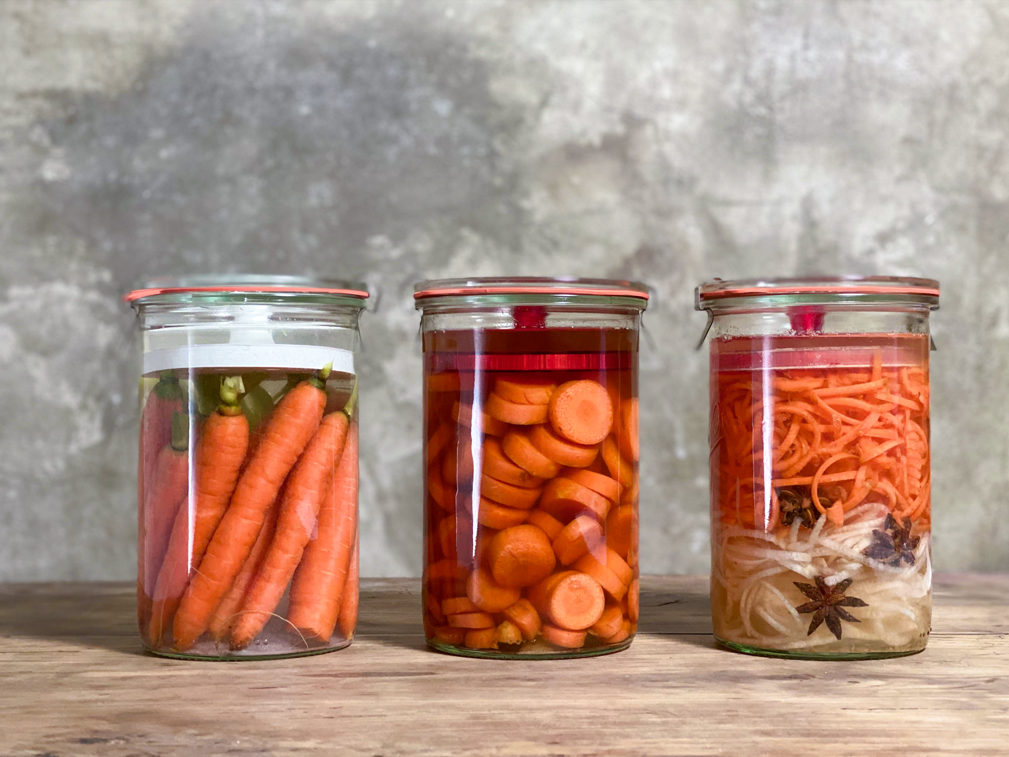 Karotten im Ganzen, Karottenscheiben in Gemüsebrühe mit Kurkuma und Karotten-Bierrettich-Nudel mit Sternanis fermentiert